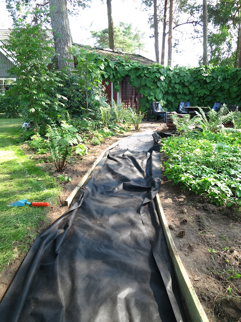 Sen var det gångens tur - gången från den övre gräsmattan ner till vår runda uteplats vid piprankan. Många rullebörar här också. Först skulle gräset och jorden (läs sanden) bort och efter att markduken kommit på plats var det dags för singel.
